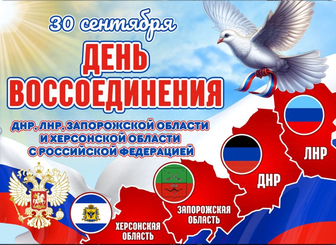 30 сентября 2022 года навсегда останется важной датой в истории нашей страны благодаря принятию в состав Российской Федерации Донецкой и Луганской народных республик, а также Запорожской и Херсонской областей в качестве полноправных субъектов государства. Граждане этих регионов долгие годы стойко защищали своё право на использование родного языка, сохранение своей культуры, традиций и веры. Решив присоединиться к России, они выразили единодушие своего народа, основываясь на историческом родстве населения этих территорий и реализовав своё законное п